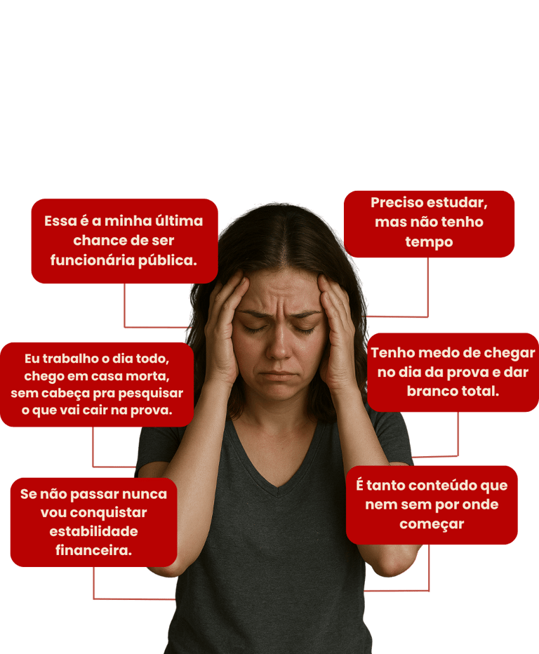 Saber que o concurso público é a sua chance de ser bem-sucedida, ter um bom salário e mudar de vida, mas se sente travada, sem tempo pra estudar e nem sabe por onde começar.